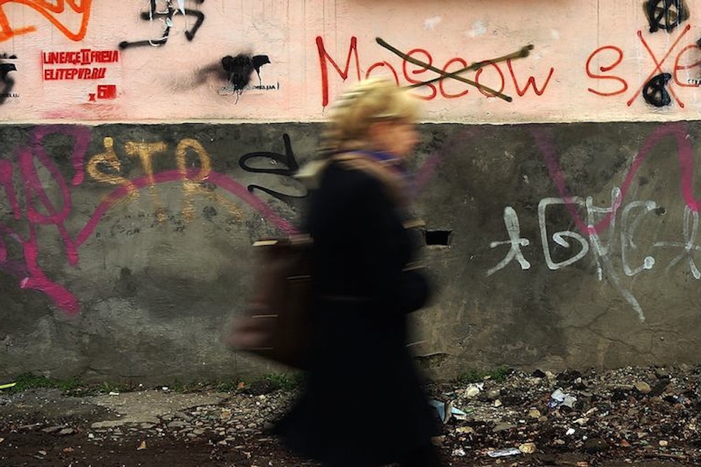 I went to a café with Tatyana Skorik, a handsome blonde Ukrainian woman whose hands shook throughout our conversation, a bracelet in the Ukrainian colors of blue and yellow trembling on her wrist. She had not gone to the square to see the Russians’ celebration, or even watched it on television. “I could not watch this, it would be like watching lunatics celebrate. The Soviet Union used to put sane people in mental hospitals, and that’s what I feel like, as if I am a sane person who’s been put in a mental hospital,” she said.