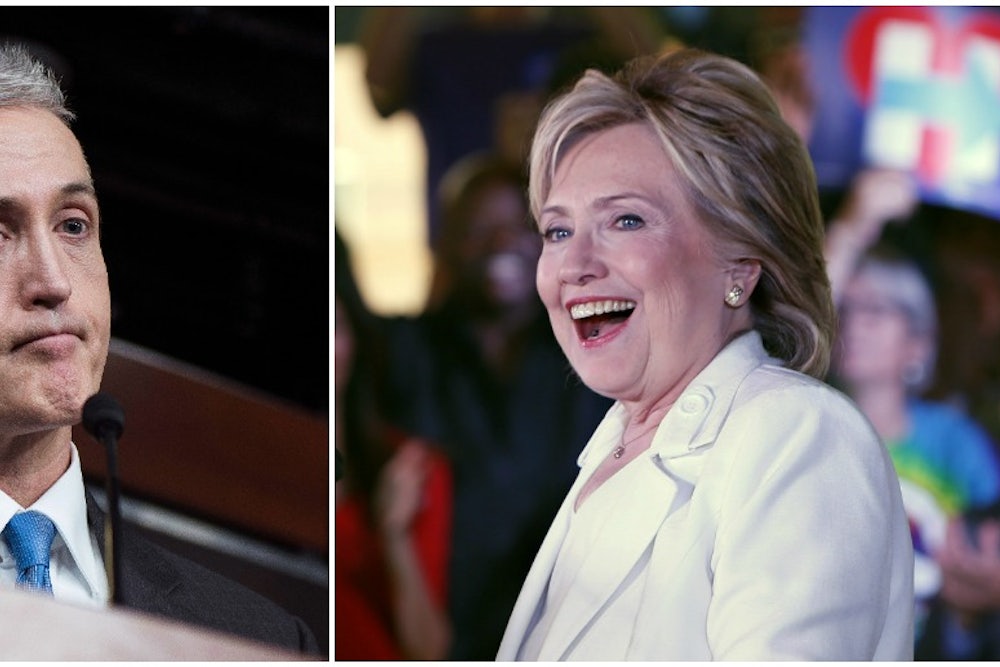 The comparison became inescapable this weekend, when the top Democrat on the Benghazi committee revealed that its Republican chairman, Trey Gowdy, had fabricated a redaction to Clinton’s emails to make it look like she’d endangered a spy, and the CIA had busted her. Gowdy even mimicked intelligence community vernacular, designating the redaction as undertaken to protect “sources and methods,” without disclosing that he was the redactor or that the CIA had cleared the name he redacted for release.