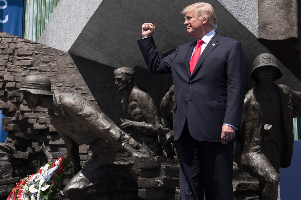 Trump’s message is that just as Poland defended its borders from the Soviet Union and Nazi Germany, so a new alliance of Western nations must stand up to those who would erase borders today: globalists and immigrants. Trump called for a new “community of nations” that, reading between the lines, is made up of white, Christian countries. Consider his chauvinism in contrasting the great achievements the West—as he imagines it—with the supposed failures of the rest of the world. “The world has never known anything like our community of nations,” Trump declared. “We write symphonies. We pursue innovation. We celebrate our ancient heroes, embrace our timeless traditions and customs, and always seek to explore and discover brand-new frontiers. We reward brilliance. We strive for excellence, and cherish inspiring works of art that honor God.”