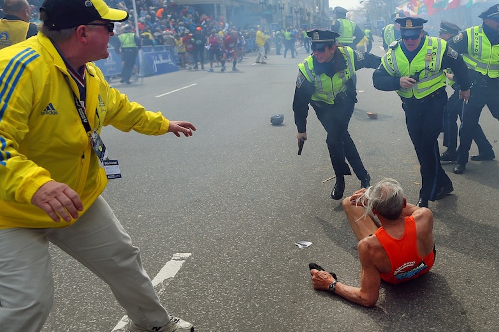 By contrast, the runner in what is quickly becoming the iconic photo, who is being aided by police after being knocked to the ground by the explosion, looks to be older. He is somebody who likely took around five hours to complete the race. He is a civilian not only in the political sense, but in the athletic sense. In other words, it seems likely that whoever was responsible for the explosions—assuming somebody was responsible—was deliberately targeting ordinary decent folk rather than the superstars. And, whatever message they were intended to convey, the explosions created the impression that being ordinary is no protection against extraordinary horror. That feeling is the definition of being terrorized.