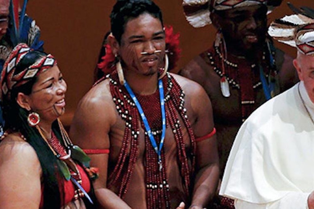 Pope Francis wears an indigenous feathered hat given to him by representatives of one of Brazil's native tribes during a meeting at the Municipal Theater in Rio de Janeiro, Brazil, Saturday, July 27, 2013.