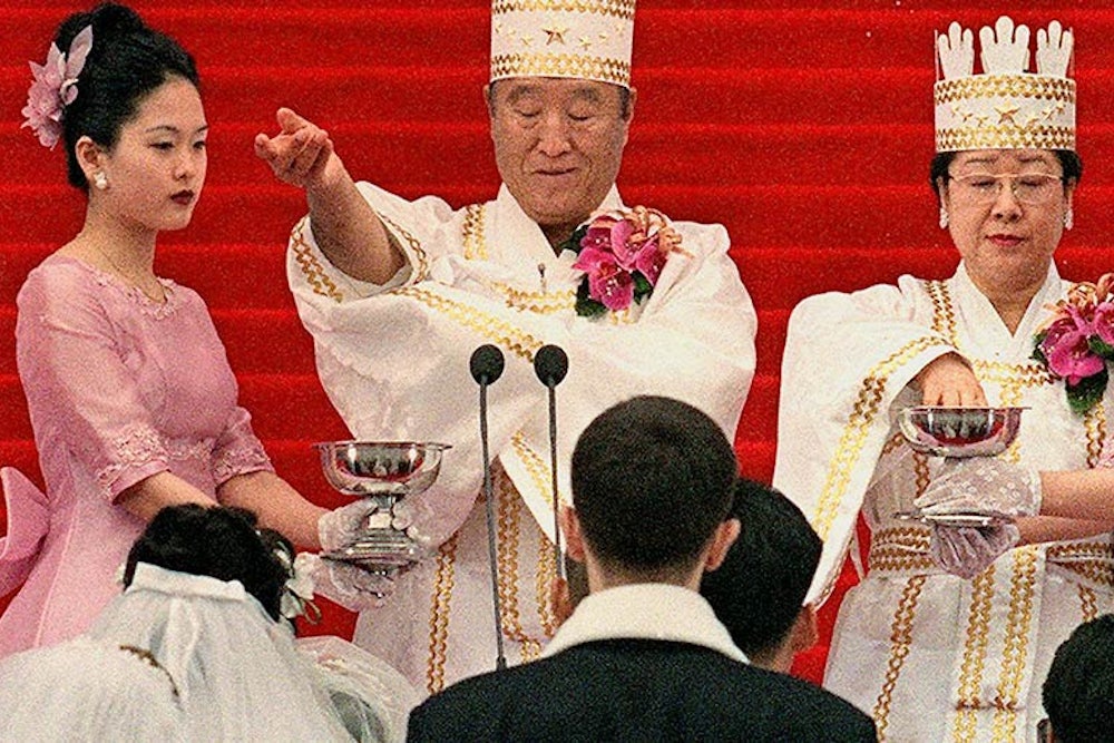Moon told his followers that they could join his sin-free bloodline by marrying a spouse of his choosing and engaging in a series of rituals. First, the newlyweds would beat each other with a bat, and then they would perform a three-day sex ceremony involving prescribed positions in front of Moon’s portrait. After the final sexual interlude—in missionary position—the bride would bow down to the groom, a confirmation that they had restored the “lost ideal of goodness.”