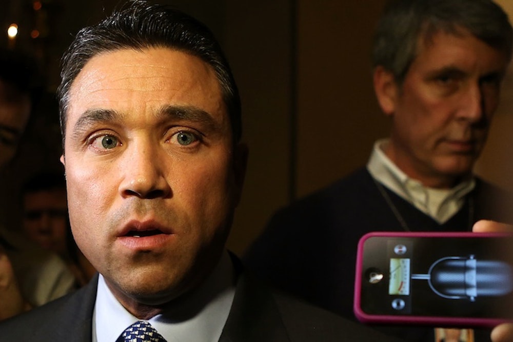 When NY1 reporter Michael Scotto tried to ask Michael Grimm, a Republican congressman from Staten Island, about his campaign finance troubles in an interview after Tuesday's State of the Union address, he found his manhood challenged. Grimm, a Marine Corps vet and a former FBI agent, said, “Let me be clear to you, you ever do that to me again I’ll throw you off this fucking balcony,” and later added, “No, no, you’re not man enough. You're not man enough. I’ll break you in half. Like a boy.”