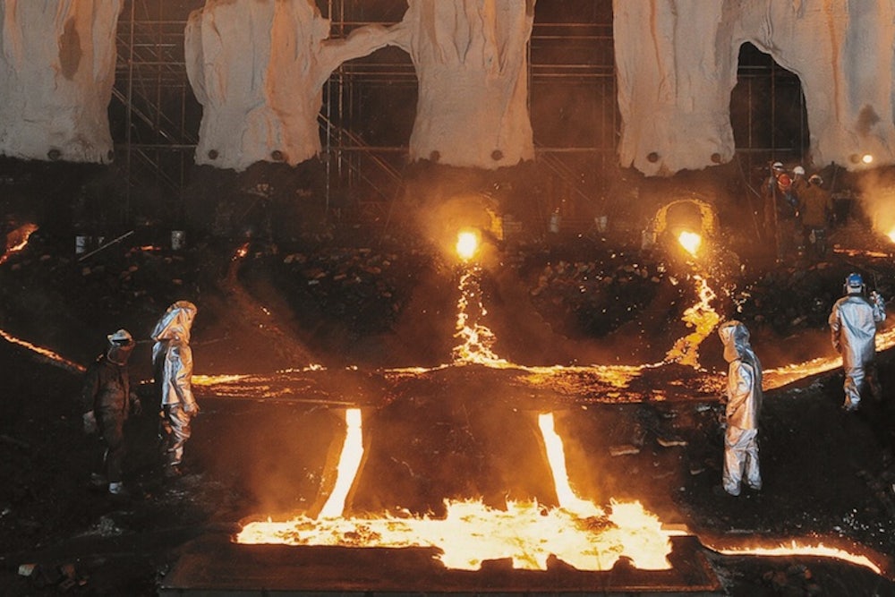 The big news—the amazement—is that Barney holds all this together for as long as he does. The first three or four hours of River of Fundament are confidently, elegantly paced. Barney has grown beyond the self-consciously static visual style of the Cremaster cycle, the set of five films (1994–2002) which have something to do with the reproductive cycle and somehow involve the murderer Gary Gilmore, the magician Harry Houdini, the actress Ursula Andress, and a red-and-gold baroque theater. In River of Fundament, his abiding obsessions with ritual, fetish, and movie-star charisma are presented with considerably more fluidity—with a roving camera eye that suggests playfulness, even wit. When Barney organizes one of his lunatic parades in Los Angeles for River of Fundament, with workingmen and musicians in fancy costumes accompanying an American-made car to its death (or is it reincarnation?), he keeps the camera in motion, so the delirious combination of Egyptomania and Chrysler-mania feels light, almost fairytale-ish. And in the first couple of hours of River of Fundament, dominated by a fictionalized wake held for Mailer in his Brooklyn Heights apartment, the chiaroscuro lighting and quickening pace make it easy to enjoy watching the talented performers, professional and amateur alike, drift through a high-flying literary-artistic celebrity mash-up. Stritch is great to watch in her owlish glasses, even if she’s reading some of Mailer’s most bombastic prose. And the artist Lawrence Weiner and the columnist Liz Smith are diverting screen presences, at ease before the camera. Paul Giamatti, playing Pharaoh Ptah-Nem-Hotep but in modern dress, has the professional’s way of bringing some dramatic sense to impossible mystico-Dadaist situations. And deeper into the movie, when Barney presents an immense iron pour staged in a nighttime Detroit, there is authentic moviemaking magic in the funky sumptuousness of the antiquated industrial architecture, the fleet of workmen like Constructivist robots in their boxy fireproof clothing, and the glittering rivulets and pools of molten metal.