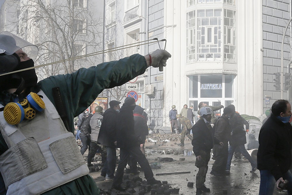 What's been happening in Kiev this winter is a textbook case. Protesters came out to the Maidan to show their opposition against Yanukovich (once again). Despite the cold, they didn't go home. They were peaceful, but only at first. The police tried to clear the Maidan, but didn't use enough force to finish the job. This brought out more protesters and, this time, they began to set up camp—and barricades. They turned the city's main square, a stadium, and one of its main streets into a war zone. They took over government buildings. The more Yanukovich negotiated with them, the more the negotiations chipped away at his legitimacy and his power.
