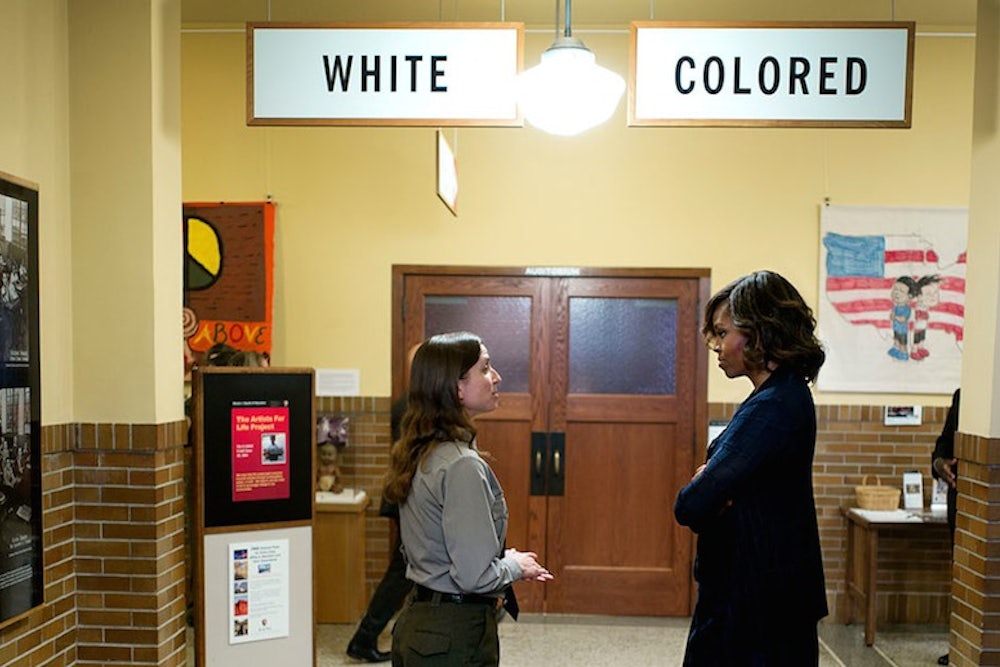At the very least, it's the most provocative image uploaded to the White House Flickr feed in 2014. The caption for Chuck Kennedy's photo reads, "First Lady Michelle Obama tours the Brown v. Board of Education National Historic Site in Topeka, Kan., May 16, 2014. Stephanie Kyriazis, Chief of Interpretation and Education, leads the tour."