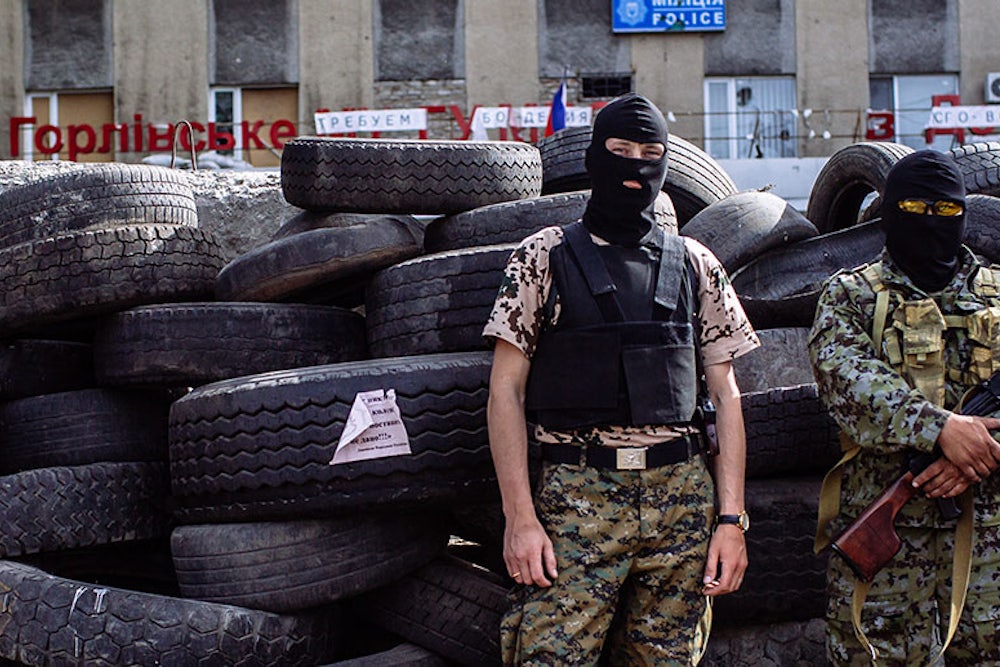 Inside the police station, the armed men sat us down at a desk, where they were watching Vladimir Putin speak from the St. Petersburg Economic Forum, and told us to wait. There were sandbags everywhere, plywood and broken windows, homely fliers bashing the fascist junta in Kiev, and, off to the side, a room stocked with giant jars of homemade picklings and preserves. We waited and waited, as heavily armed men in balaclavas rushed around, doing their best to seem incredibly, purposefully busy. One of the young men guarding us, who probably hadn't reached 20 yet, wanted to know why Putin was dallying and not helping them. "Why isn't he coming?" he said.