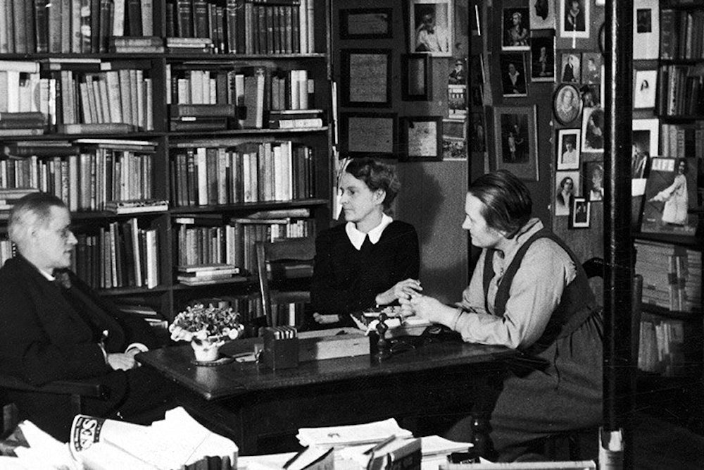 It is tea time at the Joyces’. Mrs. Joyce gives us the best tea and the nicest cakes that are to be had in any house in Paris. The children are here, now a young man and a young woman: George, a singer, Lucia, charming and retiring. Mrs. Joyce, with her rich personality, her sincere and steadfast character, is an ideal companion for a man who has to do Joyce’s work. She talks about Galway to me, and the old rain-soaked town comes before me as she talks about the square, the churches, the convent in which were passed many of her years. Some close friends, Irish, English, French, American, are here for tea. It is Joyce’s birthday—his forty-seventh—the second of February.