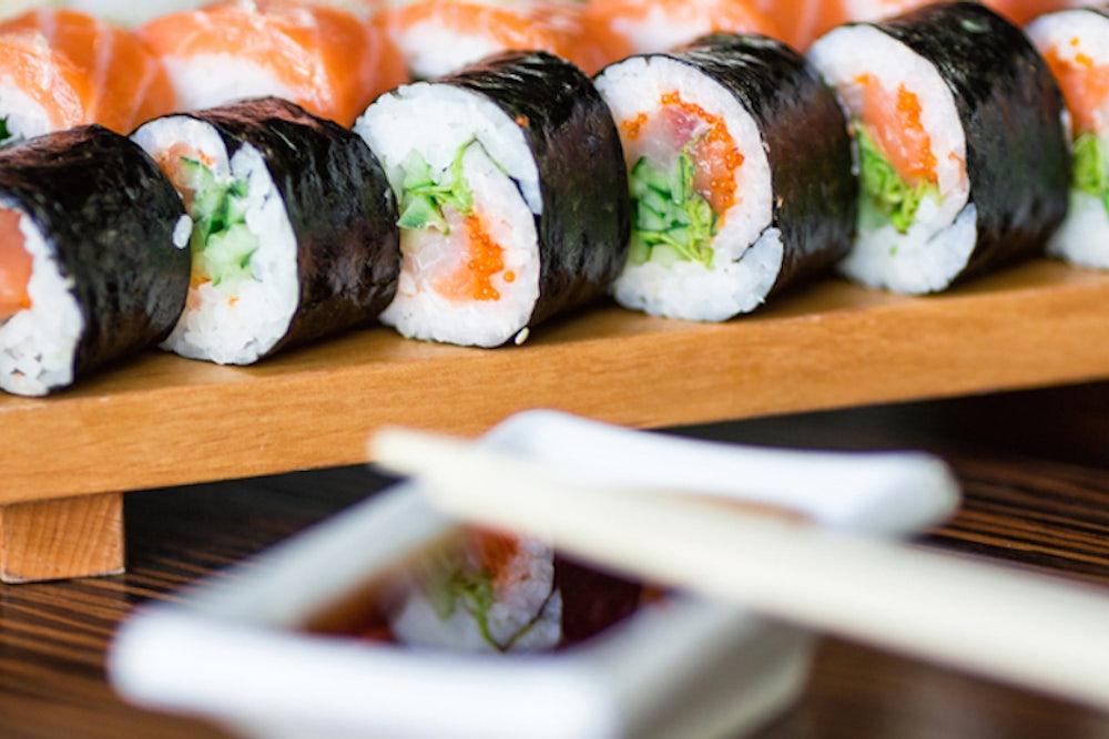 What are people eating when they talk about sex in reviews? We can study this by looking at food words that occur more frequently near sexual words. Two kinds of foods are associated with sex. One is sushi, because of the modern trend of giving sexy names to sushi like these: