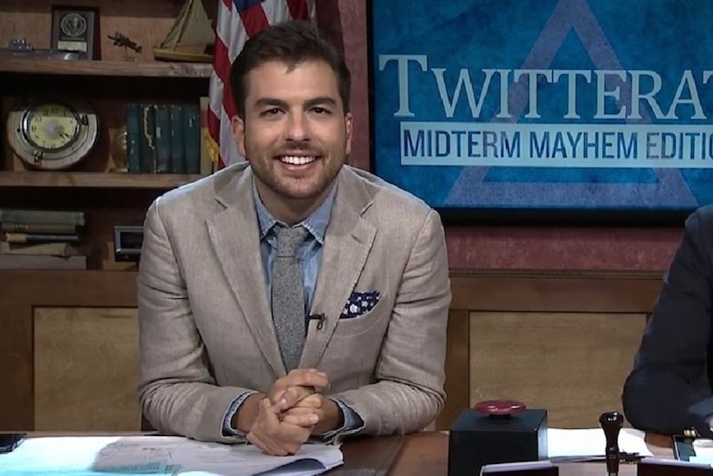 Penn—also a former White House staffer—co-hosted the “Midterm Mayhem” election night special along with the network’s Nando Vila, and the duo pitched themselves as “The Daily Show”’s younger, more stoned brother. Make that very stoned kid brother. “Is Jeanne Shaheen the coolest name in the Senate?” Penn asked Vila, drawing out the rhyme. “[Which candidate] has the biggest proverbial nut sack?” they asked one of Fusion’s political correspondents, who responded with Mitch McConnell. “I think about Mitch McConnell’s nut sack frequently,” Vila mused. The night was filled with jokes like this, about nuts and balls and dicks. Interviews with real correspondents—including the newly hired Madrigal, who offered some genuinely interesting tech commentary—were mixed in with appearances by puppets, racing turtles, and the voice of God. It’s a pity: Ramos, known for his confrontational interview style is an impressive journalist, as is anchor Alicia Menendez. But if I didn’t also have Tweetdeck open, I’m not sure if I would have learned much about the election results.