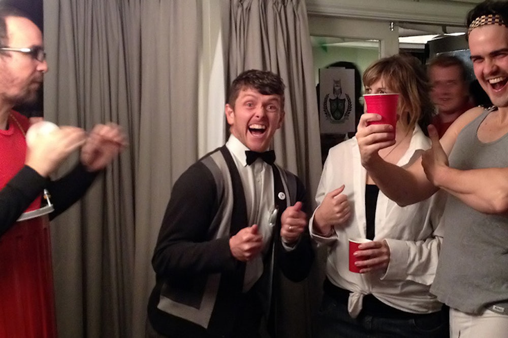 The group I’m tagging along with migrates to the house’s backyard. A few minutes later, a brother appears, looking relieved. “They gave, like, ten citations,” he says. Philly is cracking down on open containers, but the party can go on—for now. The lights are switched off. The music entreats students to put their hands up. Dixie cups of vodka and Solo cups of PBR are passed around again. Two bros clap beers, splashing on everyone around them.