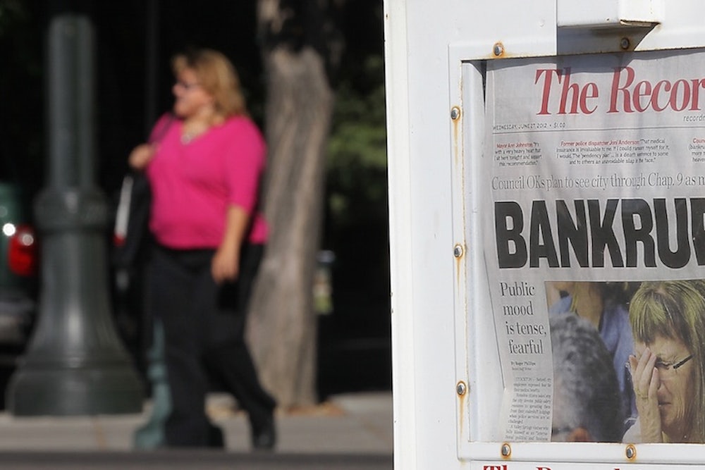 Stockton and Detroit aren't alone. Cities and states across America are facing catastrophic budget shortfalls. After decades of promising municipal employees pensions and healthcare benefits, municipalities do not have the savings to pay them out. According to a Pew report released last year, some cities had only 50 percent of the funds needed to cover pension promises, and Charleston, West Virgina, had only 24 percent funding. Now, paying off these shortfalls—and serving the debts incurred—is taking up a growing portion of municipal budgets, at the expense of essential public services.