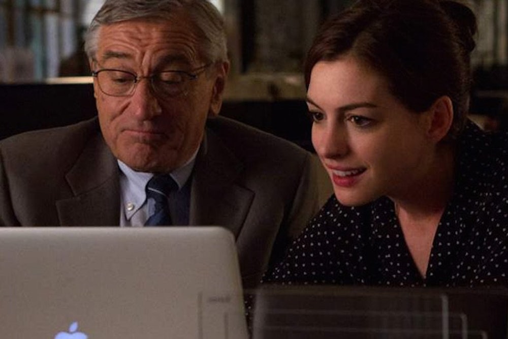 The Intern, out this week, stars Robert De Niro as Ben, a wise septuagenarian widower who is so bored of retirement that he applies to be an intern at an e-clothing company owned and run by Jules, a young go-getter played by Ann Hathaway. At first glance, the film seems to confront the problem of unemployment head on, as it begins with Ben’s search for employment, complete with a newfangled web-video cover letter. More, his function in the film is to reassure Jules about the value, and necessity of work. Though she's built her company from the ground up in a year and a half, she's worried that she's overcommitted. She's thinking about bringing in a CEO to manage the business for her and give her more time to spend with her stay-at-home husband and daughter.