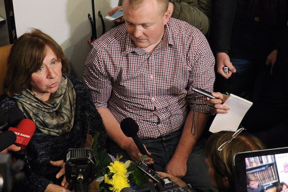 Svetlana Alexievich, a 67-year-old dissident writer who was born in Soviet Ukraine and grew up in Belarus, became the first female Russian-language writer to win the Nobel Prize in Literature Thursday. The choice was clearly a political one, as often happens with the prize, and it was understood as such: My first thought when I heard the news was that as far as the Swedish Academy is concerned, the Cold War is back. The Russian opposition journalist Oleg Kashin seemed to concur, writing that the Nobel would make Alexievich’s voice loud enough to rival Putin’s. And in her first public response, Alexievich denounced Russia’s involvement in the conflict in Ukraine, calling it an “occupation” and a “foreign invasion.”