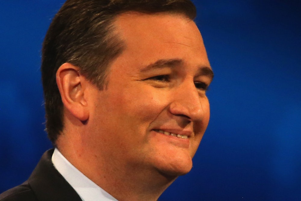 At the CNBC Republican debate, Ted Cruz really took it to his opponents—the terrible liberal media. “The questions that have been asked so far in this debate illustrate why the American people don't trust the media,” Cruz said in response to a perfectly reasonable response to a question about his opposition to a debt limit deal. The moderators, he said, had tried to create a “cage match” between the candidates, while Democratic candidates were asked questions like, “Which of you is more handsome and why?”