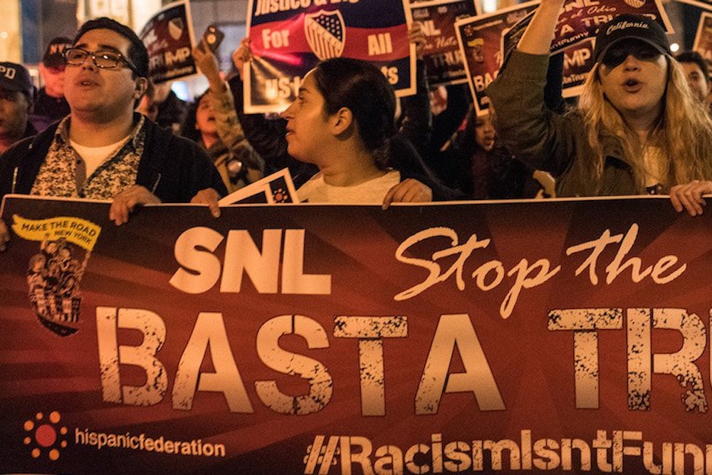 — Saturday Night Live (@nbcsnl) November 8, 2015But people who tuned in to SNL expecting to see Trump do or say something outlandish miss the danger of Trump being invited to the show. The 200 protesters who marched from Trump Tower to NBC studios Saturday night—and the more than 500,000 people who signed a petition in support of the demonstration—did so not because they were worried Trump would have another "murderers, drug dealears, rapists" moment, but because they knew he wouldn’t. As Alex Nogales, president and CEO of the National Hispanic Media Coalition, told the Huffington Post, appearing on a mainstream pop-culture platform makes Trump “look like a respectable, legitimate, non-racist.”