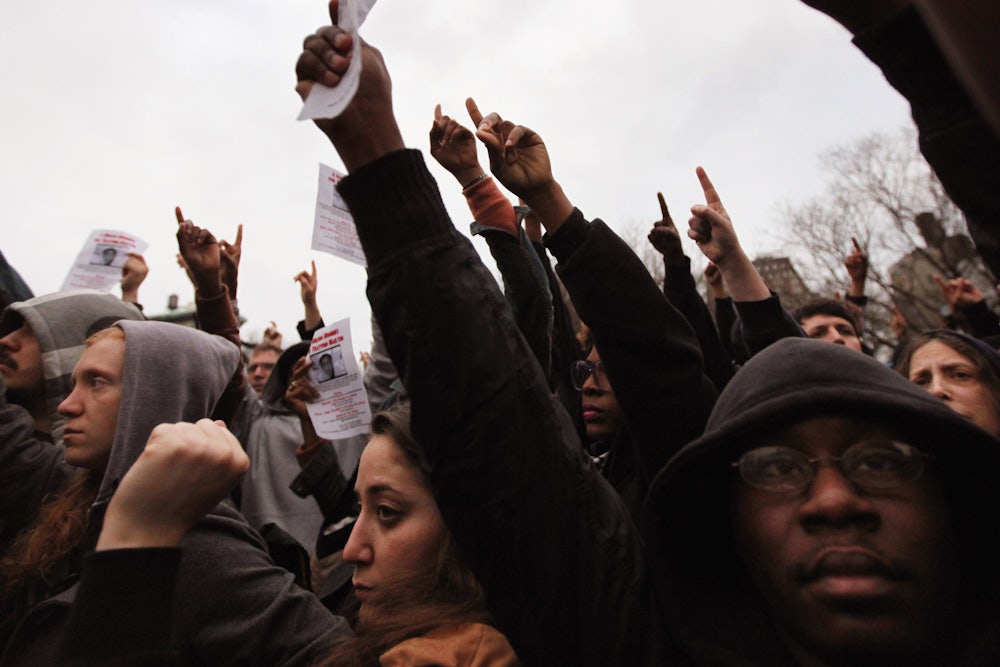 When I arrived at Union Square station, I saw that a number of my fellow New Yorkers had on “hoodies.” Were they going to the rally, their clothing a secret sign to like-minded spirits? Or was this a further delusion on my part, just a style that I hadn’t previously noticed? It turned out they were going to the rally. That beautiful, abnormally early spring evening—the daffodils fully sprung from the ground and the saucer magnolias in spectacular bloom—Union Square was crowded with flesh-and-blood people, as various as those whose pictures I had seen on my machine that morning. One of the first things that caught my eye was the familiar, huge, bright yellow-and-black “Occupy Wall Street” banner that is a parody of police yellow-and-black crime scene tape; the occupiers were there in full force. I also saw many signs with Malcolm X’s picture and his words “You Can’t Have Capitalism Without Racism”; the Harlem-based Party for Socialism and Liberation was also there.
