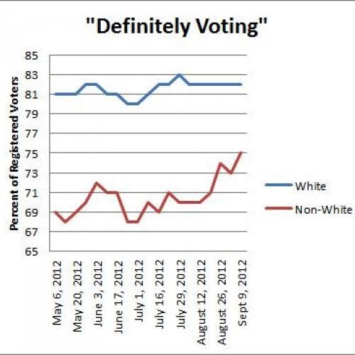 The number of non-white voters who said they would “definitely vote” increased to record highs. 81 percent of African Americans said they would “definitely vote” compared to 82 percent of whites—the smallest deficit to date. In total, 75 percent of non-white voters said they would definitely vote compared to a low of 68 in July. Only one quarter of the sample reflects the DNC, so it will be interesting to see if these numbers increase further over the coming weeks.