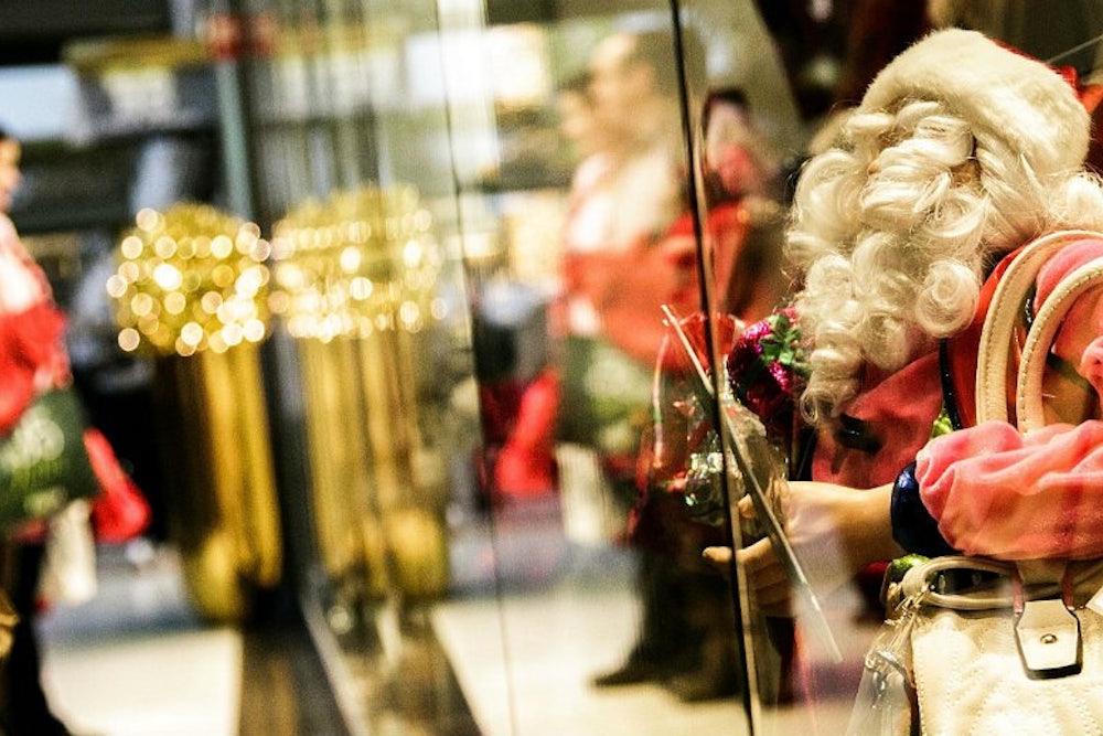 Unraveling that tangle is not easy. Schmidt unearths and deftly interprets the diaries of some middle-class women from the second half of the nineteenth century. Some fit the model of the jaded consumer, their experience of Christmas embittered by “the tincture of unmet desire,” or simply by the weariness of fighting the crowds downtown on obligatory errands. For many more of these women, however, the holiday was an opportunity to reaffirm familial ties; for parents, a chance to play Santa Claus—to give gifts without thought of reciprocation. (The temptation could be dangerous if taken too literally. In New Castle, Pennsylvania, in 1893, a well-intentioned paterfamilias climbed down his chimney with a sack of presents on Christmas Eve and remained stuck there until neighbors could rescue him; his cries for help had frightened his family from their home.) Those who had recently lost children could only go through the motions: “Am so thankful my Christmas work is over now,” Elizabeth Merchant of New York wrote in 1870. “It has become a duty now, instead of a pleasure, as it used to be when I had precious Charlie with me.” Yet fifteen years later she recorded with obvious satisfaction that another son, home from college, “came down & opened his stocking on my bed, as he has always done.”