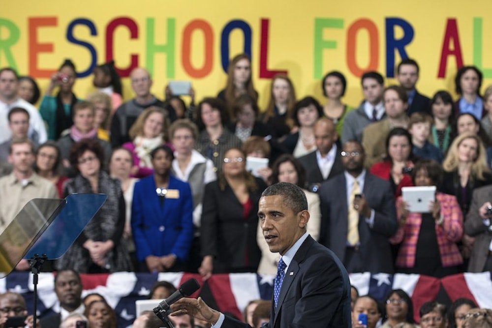 President Barack Obama visited Georgia on Thursday to tout his ambitious new proposal for universal preschool. "Let's make sure none of our kids start out the race of life already a step behind," he said. "Let's make it a national priority to give every child access to a high-quality early education." That sounds lovely, but can it work? The Daily Beast's Megan McArdle, the American Enterprise Institute's James Pethokoukis, and Slate's Matthew Yglesias have their doubts. "We have some intriguing examples of amazing preschools," Yglesias writes, voicing the common sentiment, "but little experience with bringing them up to mass scale."
