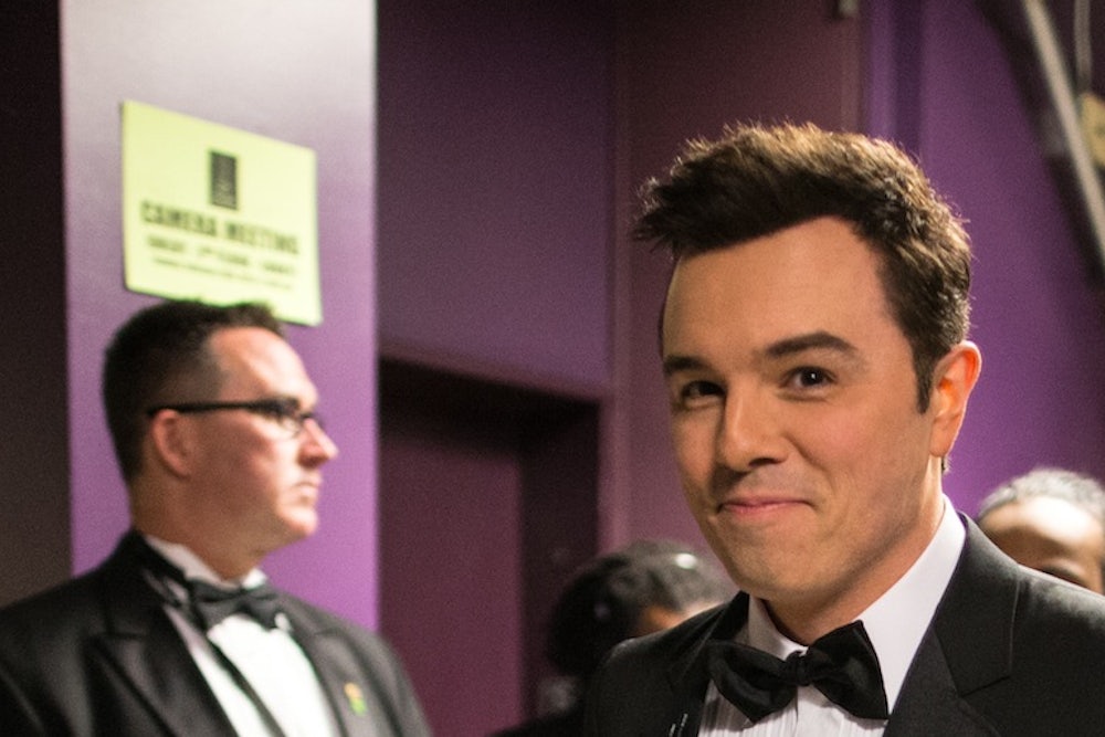 The zeitgeist’s heavy hammer—by which I mean the Internet—has landed hard on last week’s Oscar host Seth MacFarlane. The consensus: MacFarlane’s act was racist, sexist, homophobic, anti-Semitic, and, perhaps most unforgivably, not funny. Particularly insulting was the song and dance number, “We Saw Your Boobs,” during which MacFarlane highlighted members of the audience whose breasts he’d seen in movies (many of which were exposed during rape scenes), or, in the case of Scarlett Johansson, in leaked cellphone photos on the Internet. Viewers were right to be offended by MacFarlane’s demeaning routine. The women he mocked are world-class actresses. This was their night to be celebrated, not objectified by an immature jester.