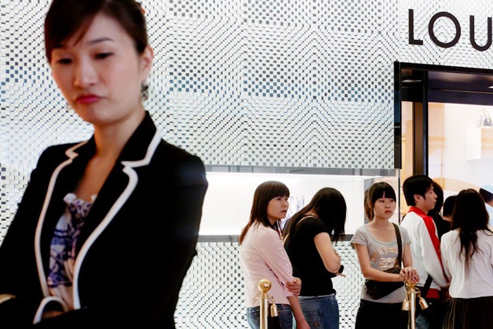 Well beyond the former British enclave on the southern coast, French goods have become the status symbol par excellence in boom-time China. Their national economy is built on mass-production and a “happy with crappy” ethos. Pricy French imports, on the other hand, are seen as synonymous with craftsmanship and prestige. A recent survey by the Hurun Institute found that upscale Chinese shoppers esteem French brands more than any other: Louis Vuitton, Hermes, Chanel, and Cartier took four of the five top brands for gifts. In the downtown shopping districts of Hong Kong, mainland Chinese buyers line up around the block to buy bags plastered with Louis Vuitton’s iconic LV. (Less picky consumers can snatch up knockoff Chanel and Louis Vuitton bags in nearly every urban market on the mainland.)