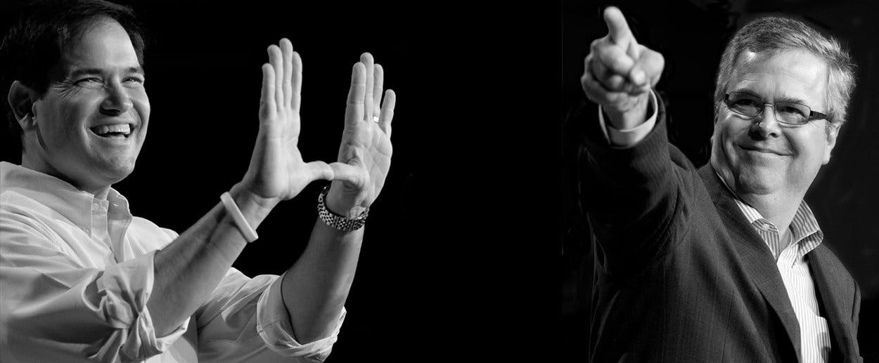 It’s election night, November 2, 2010, and Jeb Bush is all alone on stage at Marco Rubio’s victory rally. As supporters and photographers await the arrival of the new conservative star, Bush takes his substantial six-foot-three-inch frame a few steps toward the audience, clapping and cajoling them to join him in a chant: “Mar-co! Mar-co! Mar-co!” He moves stage left, where the cameras are waiting, still alone, still chanting, like a helicopter parent cheering from the sidelines. Finally, several awkward minutes later, Rubio emerges, enabling Bush to slink toward the back.