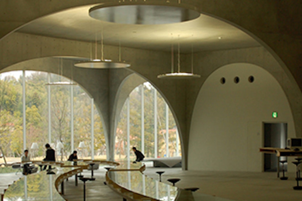 At the Tama Art University Library, Ito reconsidered the venerable Roman tradition. Roman masonry arches are heavy, muscular. They illustrate their transfer of a building’s compressive loads from sky to ground, and when they cross one another to span and enclose interior spaces, they form arch systems deployed along the predictable grid. At the Tama Library, Ito deploys, skews, and subverts the roman arch motif in multiple ways. Arches that seem almost impossibly thin are constructed not in the traditional, block-on-block manner; instead they are cut from thin steel plates, then surfaced with finished concrete. The spans of these arches are not semi-circular but elliptical, varying in dimension from a body-hugging five feet to a community-embracing 52 feet wide. And these arches are deployed not on a regular grid but along irregularly curving lines, creating highly varied interior spaces, some tight, acutely angled; others expansively oblique. Perched atop a grassy hill, the first floor of the Library contains a cafeteria serving the entire campus population, and its ground level floor slopes upward, following the topography of the hill on which the building sits.