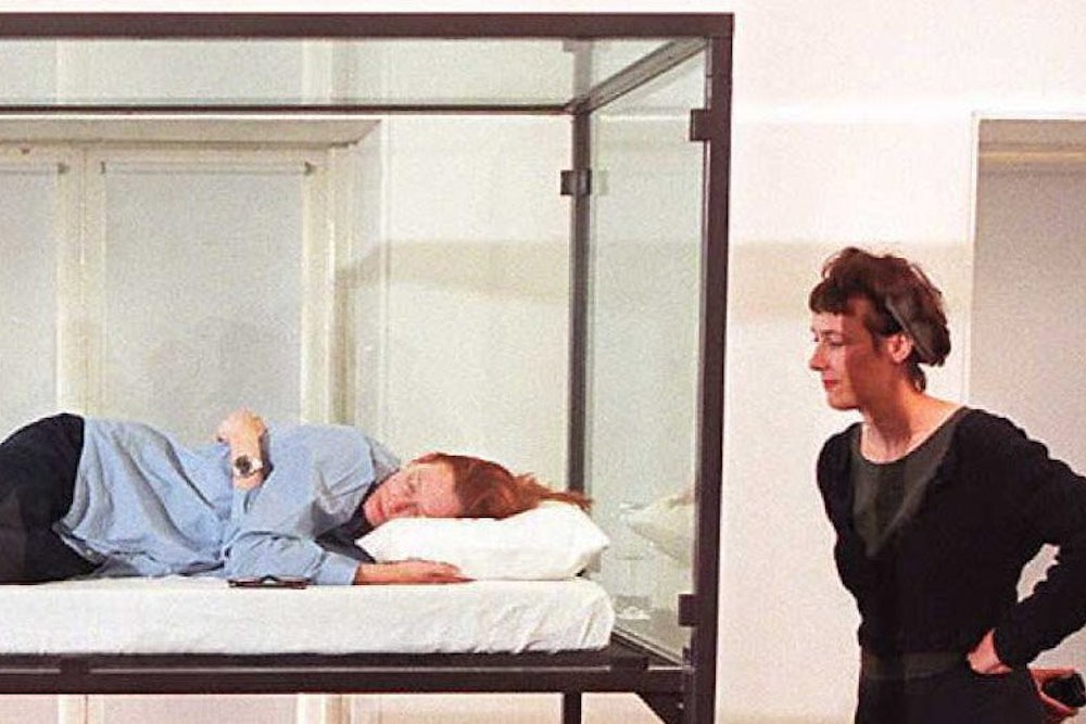 First things first: Tilda Swinton, as if you needed me to tell you this, is not an innovative artist. Not only are images of sleepers nothing new in art, from Vermeer and Watteau to Courbet and Warhol, but sleeping in a gallery holds no special novelty. It’s been over four decades since Chris Burden, the fearless and confrontational California performance artist, presented his Bed Piece (1972), in which he stripped off, lay on a mattress, and snuggled up.1 Unlike Swinton, who comes to the museum on random days and only remains on view for a couple of hours, Burden had the tenacity to stay in the bed for the entire length of his exhibition—for 22 straight days. “I had a strange power around me, sort of like a bubble or a repulsive magnet,” Burden explained in a 1974 film that documents the work. “Most people wouldn’t come close to me. In fact, most people seemed frightened.”