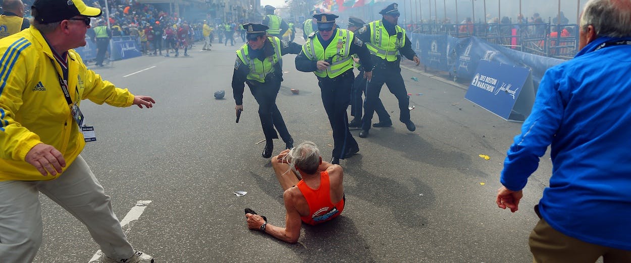 By contrast, the runner in what is quickly becoming the iconic photo, who is being aided by police after being knocked to the ground by the explosion, looks to be older. He is somebody who likely took around five hours to complete the race. He is a civilian not only in the political sense, but in the athletic sense. In other words, it seems likely that whoever was responsible for the explosions—assuming somebody was responsible—was deliberately targeting ordinary decent folk rather than the superstars. And, whatever message they were intended to convey, the explosions created the impression that being ordinary is no protection against extraordinary horror. That feeling is the definition of being terrorized.