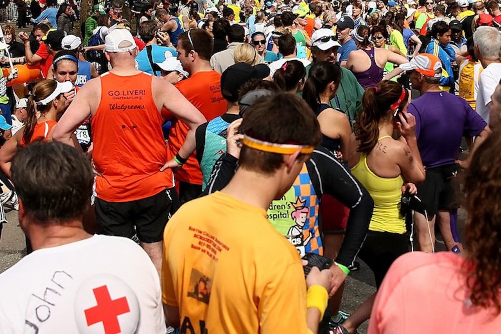 The runners milled around, stymied. Their cell phones, by that point, were useless. Many were from out of town, or even from overseas, clueless as to where they were or how to get to where they were staying. Others, frantic, tried to reach family who had been waiting for them at the finish line. Frat brothers came out of a nearby house and started passing out bottles of water just as the police announced that there would be buses arriving up the road at Temple Ohabei-Shalom to pick up runners and take them to " a staging area."