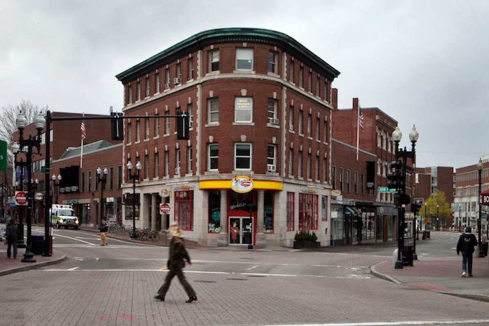 Even more than the images of SWAT teams rolling through semi-suburban neighborhoods, police robots crawling the streets, men in bullet-proof vests pointing guns though white picket fences, and the Helicopter hovering like an insect against a steely sky (if it has become cliché to talk about the bright blueness of the sky on September 11, I foresee a grayer trope playing out in the narrative of today’s events), it is the images of a deserted Kenmore Square and the empty crosswalk in front of South Station that impress the utter strangeness of today’s events. It’s trite to say that a certain city won’t stand for this or that (“Washington can’t handle weather!”)—but it must be accurate to say that Boston is not a city that shuts down quickly. When I attended college there, I regularly trudged my way to class through two feet of snow.