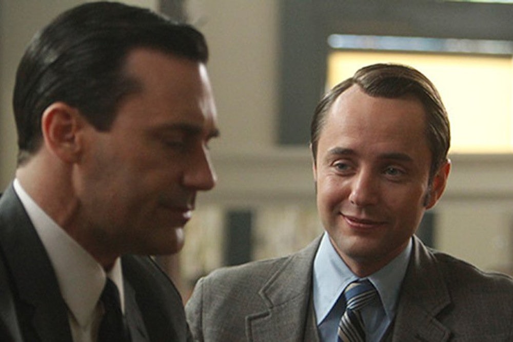 Dear Television, Episode four—titled “To Have and To Hold,” after the soap opera on which Megan Draper stars—opens with Sterling Cooper Draper Pryce (SCDP) still chasing “the prestige that comes with ketchup.” Pete and Don have arranged to meet Timmy from Heinz at Pete’s sad bachelor pad, where, it seems, he’s living full-time now that Trudie has kicked him out. (“It’s… available to you,” Pete awkwardly tells Don after the client has left, a nod to the premise of Billy Wilder’s 1960 film The Apartment, in which executives share an apartment for their philandering—an allusion which may be intended to signal how behind the times poor Pete is. “I live here,” Don witheringly reminds Pete.)
