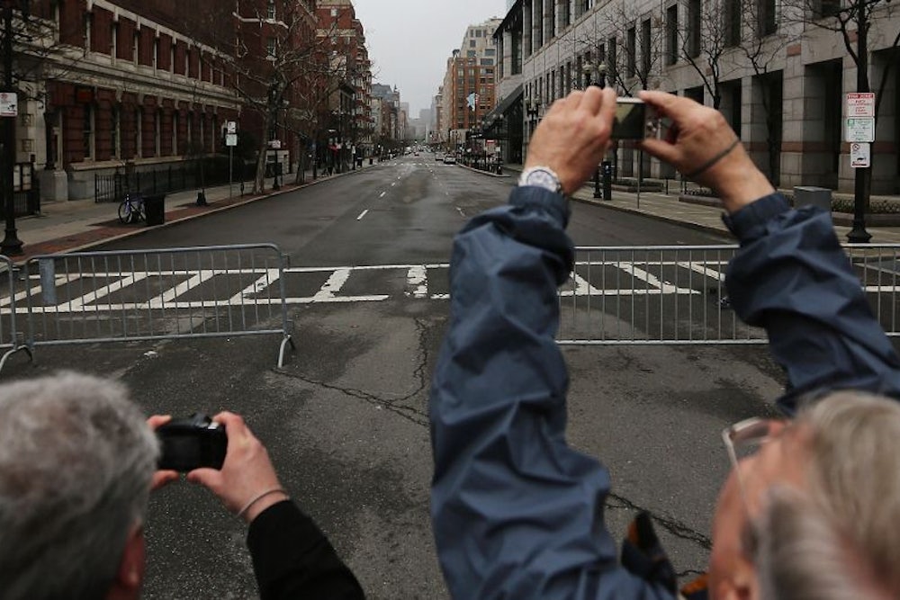 Almost as soon as the bombs exploded on Boylston Street the calls were heard to move on. “Repair the sidewalk immediately,” exhorted one commentator, “fix the windows, fill the holes, and leave no trace—no shrines, no flowers, no statues, no plaques—and return life to normal there as fast as possible.” Anything less would be a victory for the terrorists, who should not be allowed, as if it is within our power to disallow it, to leave “even the smallest scar” on our cities and our psyches. “The best response to a tragedy such as the one in Boston,” declared another commentator, “is to go on with your life, eyes open.” The advice was perfectly anodyne—but who, except the victims of the atrocity, was preparing to do anything else? A security expert pronounced that “this is a singular event, and not something that should drive policy.” His certainty that there was nothing to be learned from the attack was expressed long before we learned very much about the attack. There was a lot of uplift, too, in the discussion of the horror, which was understandable, since there is nothing as comforting as cliché; but it seemed similarly panicked by the prospect of a rupture in quotidian American existence, of a disruption in the inertia of a good life. Some of this silly balm consisted in local chauvinism: suddenly everybody was singing the Standells. “They picked the wrong city,” President Obama said, along with many others. Which city would have been the right city? He also proclaimed proudly that “Americans refuse to be terrorized.” But Americans were terrorized, on the day of the bombing and on the day of the manhunt; and they were right to be terrorized, because what they had in their midst was terrorism.