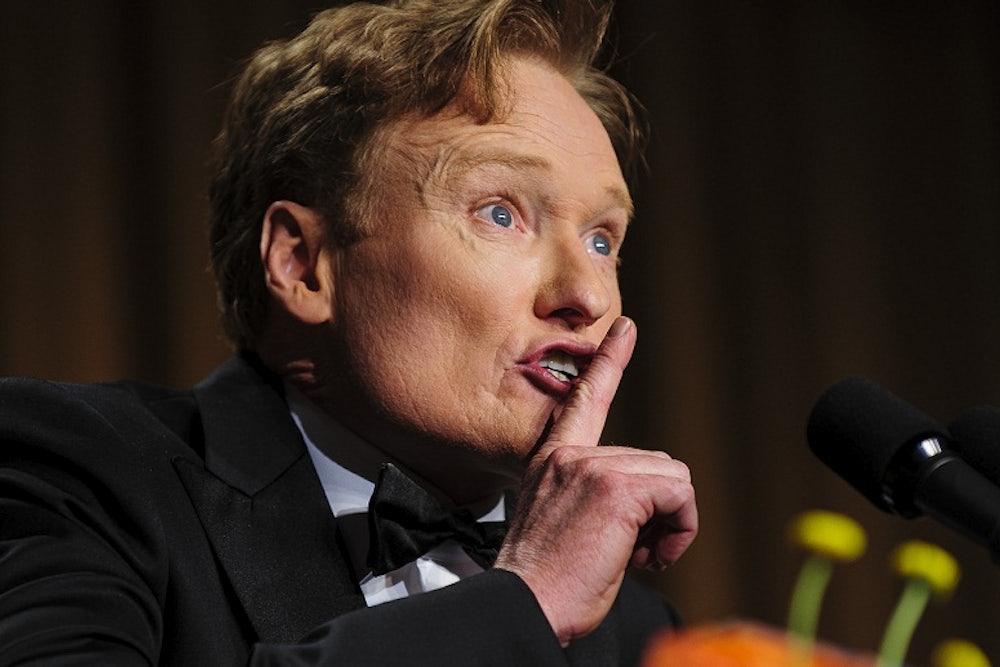 When Conan O’Brien took the stage Saturday night at the White House Correspondents’ Dinner, he looked a bit like a giant, flame-haired mannequin, smiling tensely and reciting his jokes with one eye trained on his notes. His political barbs were toothless (“It gives me great pleasure to know that if the president ever has to let [Jack Lew] go, he’ll be able to say, it’s not Lew, it’s me”) and his delivery was unusually stiff. It was a far cry from his 1995 performance, in which he was loose and weird and confident, barely glancing down at the podium. In ’95 not every joke landed—and watching the monologue eighteen years later is a strange, head-scratching little time capsule to the nineties’ political landscape—but still Conan on the whole was irreverent and breezily self-assured. He interviewed a giant, animated photograph of the president, a stunt familiar from his NBC talk show, as the real Clinton cracked up onstage. Some of his most astute media jokes even work in today’s context: “I think the press should be applauded from finally shifting focus from Mrs. Clinton’s hairstyle to [O.J. Simpson prosecutor] Marcia Clark’s,” he said.