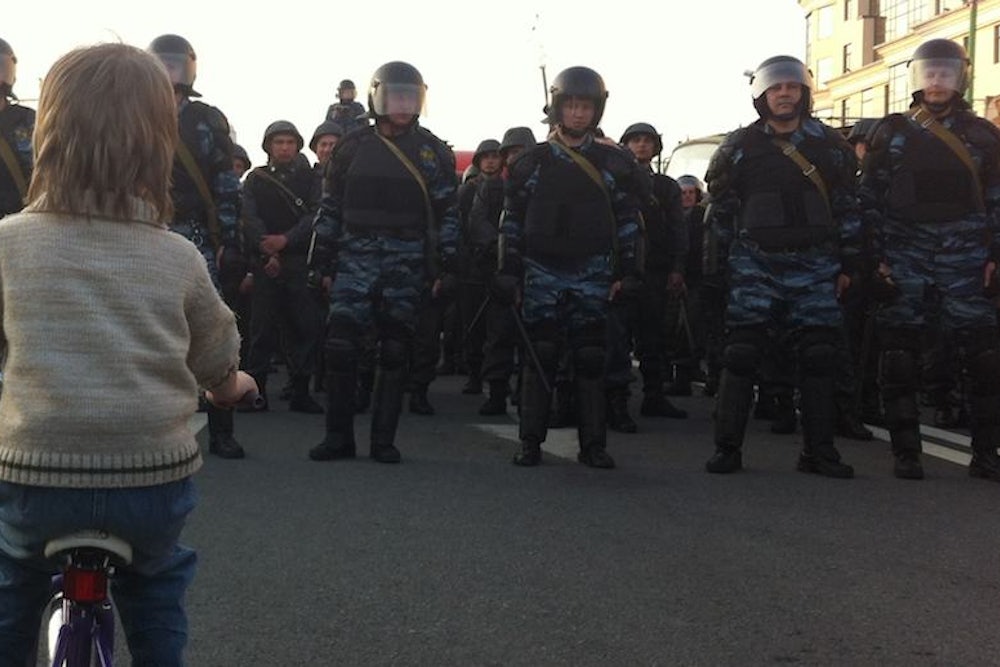 Last year, on May 6, the day before Vladimir Putin was inaugurated president of the Russian Federation for the third time, tens of thousands of people marched peacefully down a wide Moscow avenue to Bolotnaya Square, an act that itself commemorated the first mass protest against Putin’s government on December 10, 2011. It was a heady time: People were angry and fed up with the government’s increasingly ham-fisted lies, and they were giddy at the discovery that there were tens of thousands of people in an atomized, sprawling city who were just like them, a fact that the Russian media had done its best to keep from anyone.