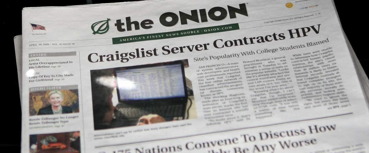 Setting aside the fact that most of these pieces are painfully unfunny, the equivalent of an April Fool's joke writ large—Hey guess what you guys I'm pregnant! You are, wow? No, just kidding! <"Price Is Right" losing horn>—their proliferation could do actual damage to political discourse and the media in general. Granted, those noble traditions are on life support as is; still, satire is supposed to shed light on important truths that are hard to swallow (which is what The Onion, unlike its knockoffs, typically manages to do). Juicing an already true-enough premise with more unbelievability simply adds to the informational noise pollution—without even the expected payoff of a laugh.