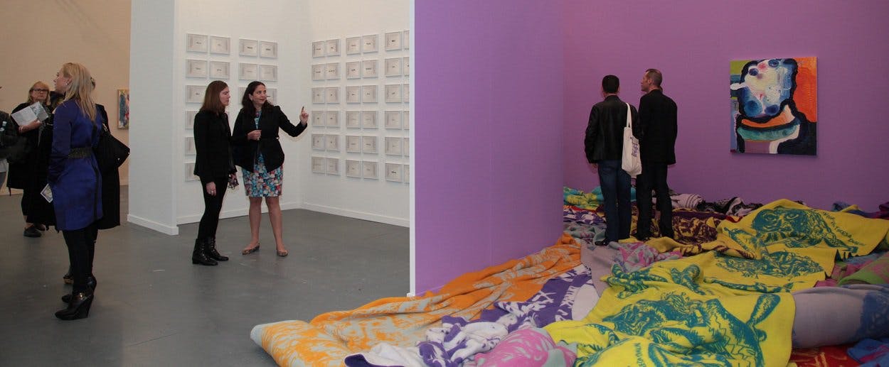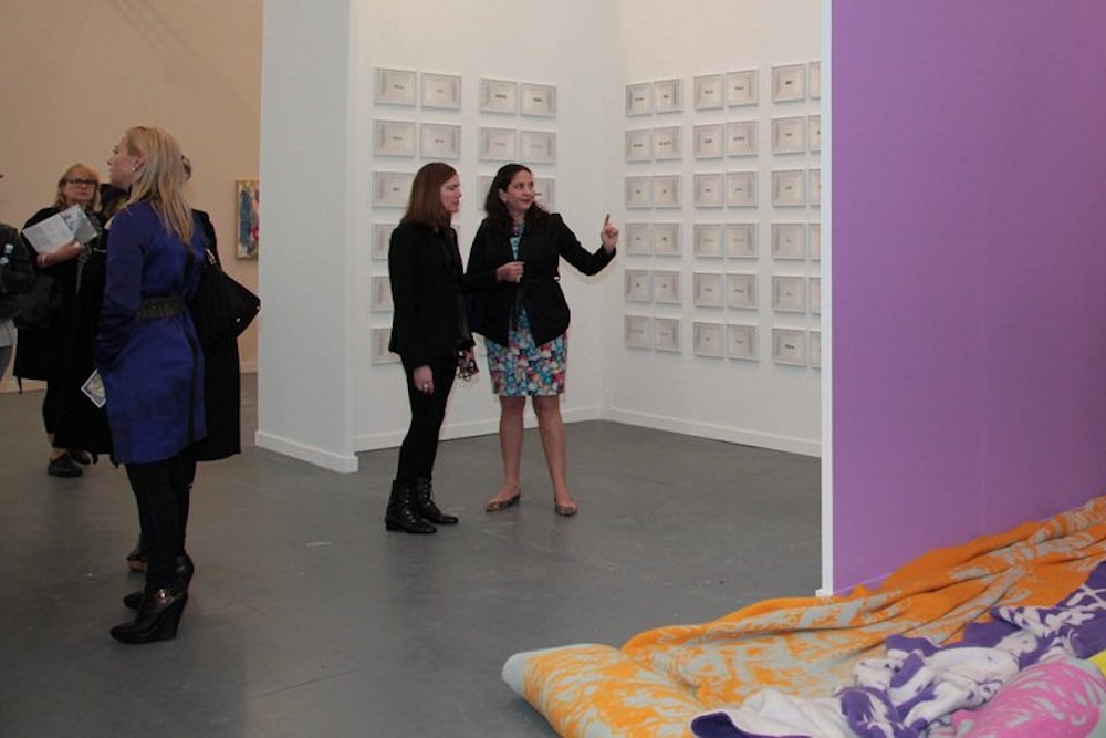 I am sorry to be a party pooper. Of course I get a buzz out of Frieze, what with the people-watching and the suave food concessions (Blue Bottle Coffee, Court Street Grocers, The Fat Radish, Sant Ambroeus, and so forth). I could write about the work I saw that stood out a bit, including Mai-Thu Perret’s miniscule, minimalist, and possibly mystical gameboard-like paintings at Zurich’s Galerie Francesca Pia and Simon Evans’s pale, all-over collages featuring bits and pieces of lined paper and graph paper at New York’s James Cohan. But under the circumstances I refuse to be the well-behaved art critic assigning B- to this and C+ to that and maybe even a provisional midterm grade of A-. Everything about Frieze—from the blinding white light to the open floor plan with galleries flowing one into the other—is designed to obliterate any particular impression. And that’s what’s wrong with the whole godforsaken glamorous weekend. At Frieze, you’re being pushed to groove, not to grapple. You’re in the know, but you’re a know nothing.
