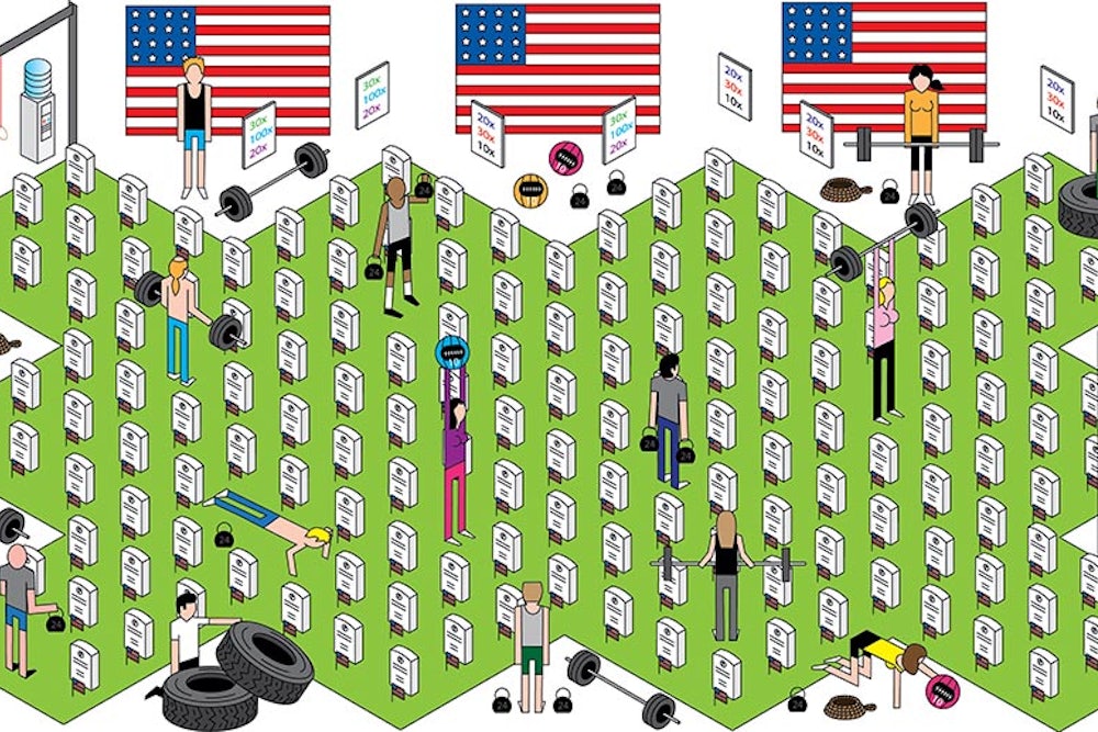 There’s a militaristic strain to each WOD, a boot-camp quality that makes each rep feel as if something’s at stake besides hip fat or glute strength. The coach is always circling, yelling, commanding you to never drop that bar. Burpees are compared to the movements you might make in combat before you engage the enemy and sprint 30 yards to save your wounded friend. Today, these military-style workouts (P90X, Tough Mudder, SEALFit) are commonplace alternatives to the gym. Marines train with CrossFit, but so do soccer moms. It’s this militarization, this puke-inducing exertion, that keeps me coming back—and that occasionally startles me with its politics.