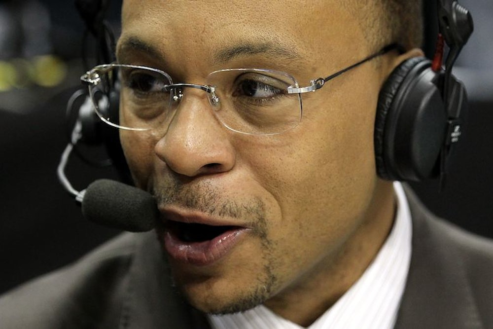 Soccer fans call the sport, without irony, “The Beautiful Game.” Sportscaster Gus Johnson, by contrast, does not luxuriate in the beauty of any game. The 45-year-old Detroit native is known to American fans of football and basketball for catchphrases and ecstatic calls more befitting a fan than an announcer. It has been said that Johnson puts the “madness” in March Madness, and YouTube is full of proof—like “Screaming Gus Johnson,” a clip of his call in a 2006 NCAA tournament game, after which Bryant Gumbel quips to viewers, “Gus will be out of the hospital in time for tomorrow’s game.” (ESPN’s Bill Simmons has postulated a tongue-in-cheek “Law of Gus,” which states that if Johnson is calling a game, dramatic moments are more likely to occur.) The typical criticism of Johnson is that he capitalizes on these moments at the expense of play-by-play; it is the color commentator, after all, who should be providing color. You could rebut that criticism by arguing that the emotion he brings to those moments more than makes up for his technical shortcomings. He’s like an enthusiastic terrier whose excited yips, even when a touch too loud or frequent or ill-timed, are endearing.