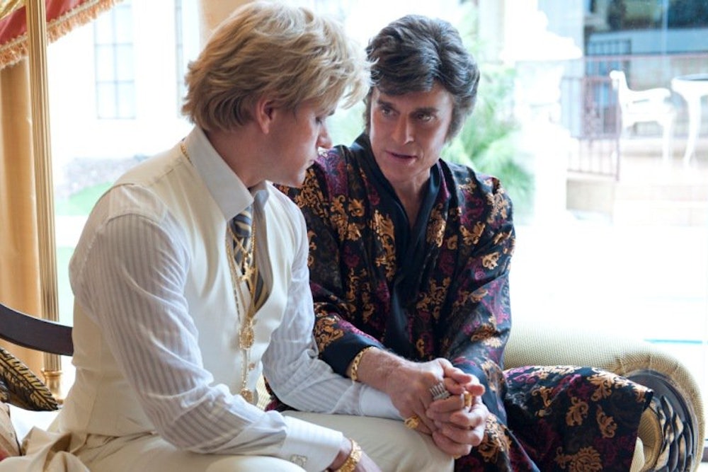 Michael Douglas (whose father was of Russian descent) is a much better actor than he has been given credit for. He does not look like Wladziu Valentino Liberace (half Polish, half Italian, all show business); he looks like a clever actor pretending to be him. The most important distinction coming out of that gap is that Douglas, in his eyes and in his voice, is too smart and too knowing to attempt to pretend that Liberace was not gay. By 2013, that effort would be ridiculous, uncool, and vulgar. If there was ever any feeling that Douglas might be inwardly nervous about playing gay, that can be put to rest. Michael Douglas has a confidence in his own sexuality, and in the power of pretending. That’s what makes his performance here so attractive and amusing: He stands aside from Liberace as if to say, “Can you believe this guy?” Whereas Liberace did believe in that awful, very uncool guy.