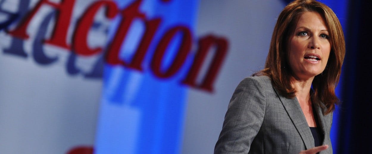 And so she pledged repeatedly to never sign a debt ceiling hike if she were elected president. To call this position of hers, or her personally, stupid, would have let this off the hook too easily. What if she wasn't? What if she was just awful? Her most egregious move may have come last summer, when she smeared Secretary of State Hillary Clinton's longtime aide Huma Abedin as being in cahoots with the Muslim Brotherhood's perceived attempts to infiltrate "the highest reaches of the federal government." Her evidence was ... limited. She relied upon lunatic sources like Frank Gaffney, who likely checks for Muslims under his bed each night before going to sleep. Per Salon: