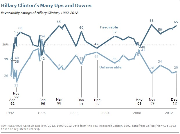 The main issue is that Clinton is unlikely to maintain her extraordinary popularity through 2016. Her popularity was boosted by her position as Secretary of State, where she remained above domestic political disputes for four years. Perhaps for that reason, most of Clinton’s predecessors, like Condoleezza Rice and Colin Powell, have been broadly popular, as well. As she re-enters the fray and Republicans redirect their attacks away from the president and toward the ’16 Democratic frontrunner, her sky-high favorability rating will probably drop, as it has in the past. For instance, her ratings started out high as First Lady, but dropped when she pursued health care reform. The Monica Lewinsky scandal restored her popularity, but her pursuit of the Senate and Presidency brought her numbers back to earth. Her ratings surged once again after withdrawing from the 2008 presidential primaries.
