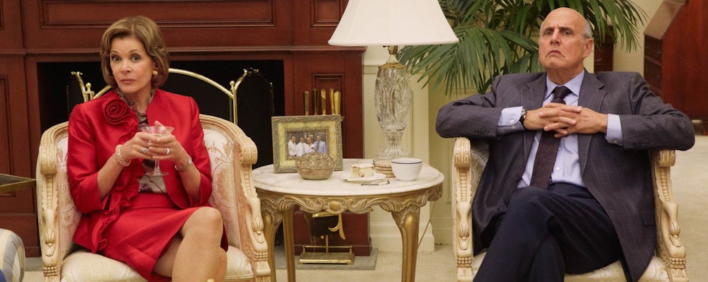 The darkness of the show is evident, too, in the way it handles its political context. The first three seasons’ morbid, grim humor—the Iraq plot line in which Gob stood in front of the Mission Accomplished banner as a model home crumbled around him, Buster losing his hand to a bowtie-wearing seal, the looming threat of homelessness—had a lightness to it, in part because the economy had not yet exploded. This gave the show as a whole an atmosphere of bouncy obliviousness rather than genuine gloom. Now season four has countless reminders of the newly bleak economic context. “In more grim economic news...” the TV, always set to Fox, blares in one scene. The Bluth model homes are referred to as “memorials to the death of the housing market.” The fraying luxury and fragile prosperity that so cannily encapsulated the show’s era and milieu when it first aired has given way to broader, clunkier satire. The Bluths attempt to bribe right-wing candidate Herbert Love, a clear Herman Cain jab that feels distinctly out-of-date in 2013 (also: the “game changer” reference), into supporting a wall between the U.S. and Mexico. (Later, they change their minds and crusade against the wall.) Both the Herbert Love plot and the Mexican wall storyline, drawn out over the course of the season, quickly grow stale and dull.