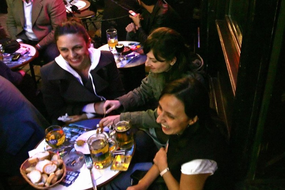 Feeling uneasy, aware suddenly of how the world was both big and very small, I squirmed as a new crowd of men closed in. With none of the rolled-out-bed flair of the hipsters surrounding us, these new guys looked hungry, maybe angry. They were not here for the book party. I imagined their father and grandfathers beating Greek people to death. Yet, when one saw me staring, he began to make up a wrap from his heavily piled plate, stuffing a lettuce leaf with red paste, and he did it with such bonhomie that I felt like I couldn't refuse. Eating, I found the concoction too fiery so I drank instead, learning later—suffering—that I'd eaten raw meat.