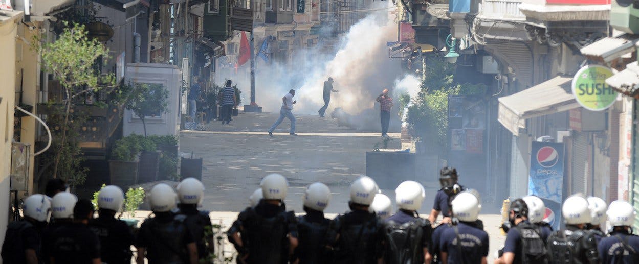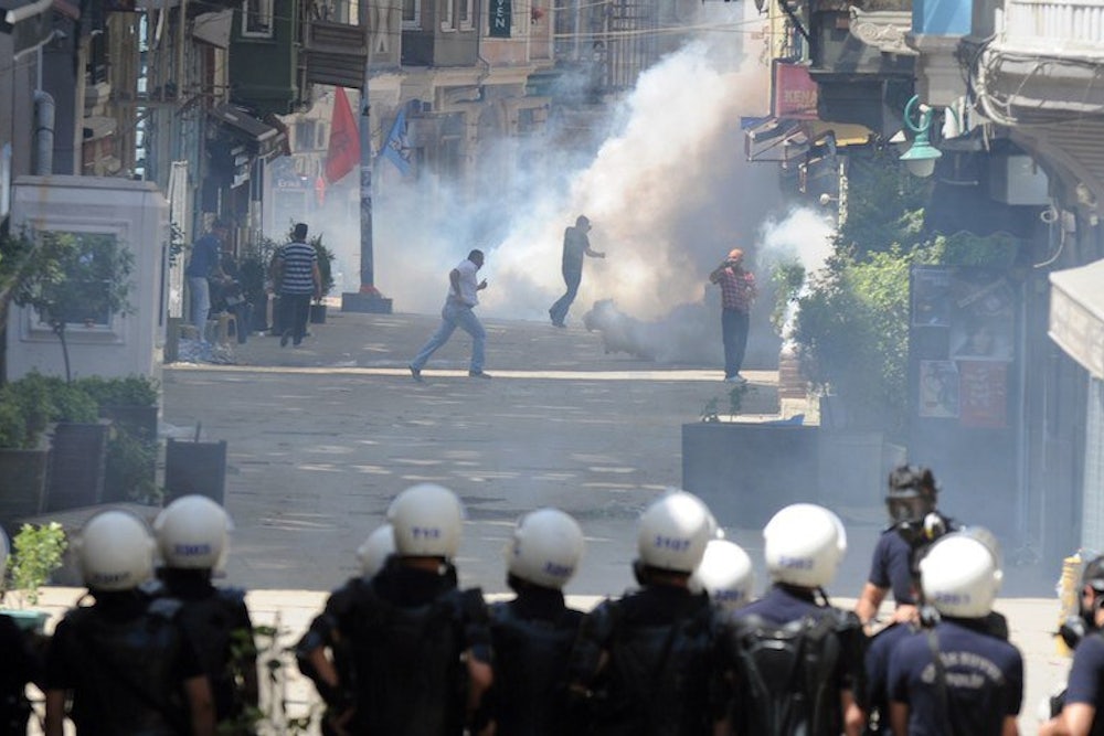 It has been 14 days since a small group of protesters first entered Istanbul's Gezi Park to protect it from demolition, and twelve days since that protest grew into the most comprehensive challenge to AKP since it took power ten years ago. Early this morning, Tuesday, the mayor of Istanbul promised that police would not enter Gezi Park, but hours later Turkish television showed black-uniformed police ascending the staircase into the tent city. Around 8 p.m., riot police began showering the packed square with tear gas, sending crowds running down nearby streets. Erdogan, who has been back from North Africa long enough to declare an intolerance for further protests, is scheduled to meet with the Taksim Platform, a group representing the protesters, tomorrow. It's unclear whether that talk will still happen, or if it does, what the protesters and Erdogan have left to talk about.