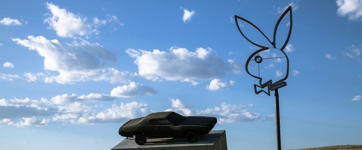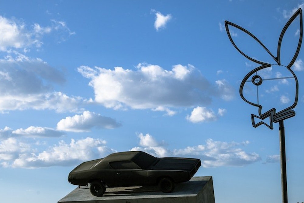 US Route 90 can seem to stretch on forever as it rolls through the Chihuahuan Desert in the parched western stretches of Texas. But for sojourning cultural tourists en route through the barren landscape, a new, giant work of art—if “art” is the right word—outside the town of Marfa now disrupts the monotonous highway. Sitting along Route 90 is a 1972 Dodge Charger, painted jet black and mounted on a banked cement platform, alongside a neon sign in the shape of the Playboy bunny. At night the bunny, which stands forty feet in the air, glows white in the darkness. It’s the only sign visible for miles.