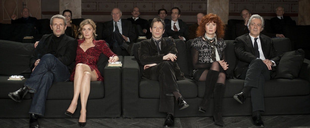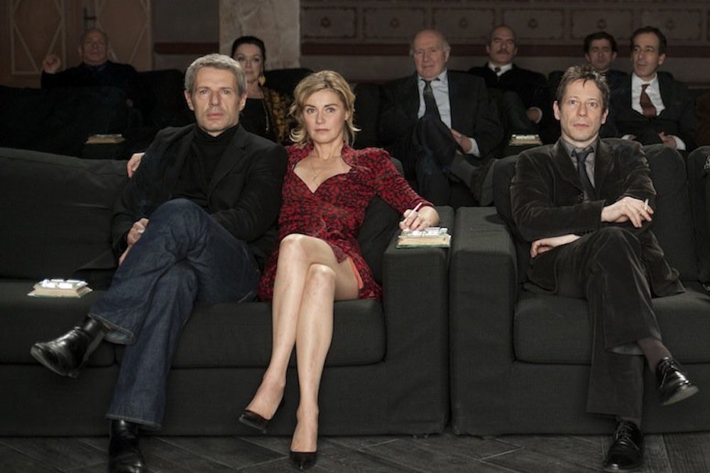 You Ain’t Seen Nothin’ Yet brings its own surprises. Resnais has turned to a famous play, Eurydice, written by Jean Anouilh in 1941, and has asked Laurent Herbiet to help him fashion a framework for it that will serve as a kind of professional farewell for him. So we begin with a play that is already a modern version of the Orpheus-Eurydice legend and move through more revisions. The film opens with a series of calls to elderly famous French actors informing them that the playwright Antoine d’Anthac has died and that he wanted them to come to his house for the reading of his will and funeral service. (D’Anthac turns out to be a pseudonym for Anouilh, to facilitate the story.) They all arrive at this huge house—Lambert Wilson, Sabine Azéma, Michel Piccoli, and others—and are told that they are the first to see a large videoscope of a provincial theater’s rehearsal of Eurydice, a play they have all been in themselves and which Resnais has done with some of them.
