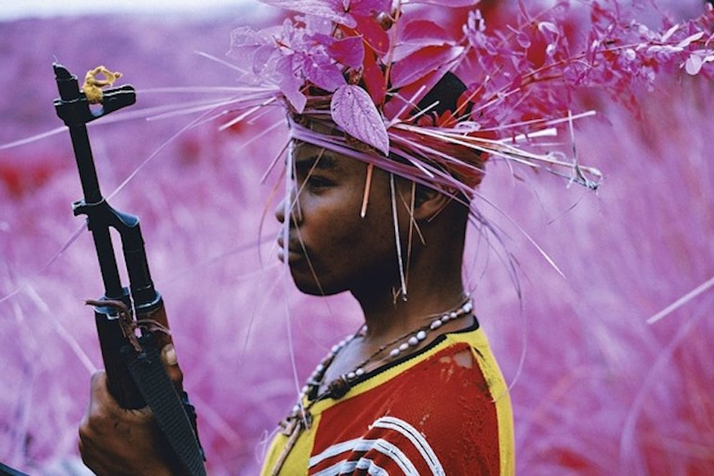 Throughout 2012, Irish photographer Richard Mosse and his collaborators, Trevor Tweeten and Ben Frost, traveled the Democratic Republic of Congo, taking video and photographs of rebel groups with Kodak Aerochrome film. Developed for the military in the 1940s, the infrared film captures greens in shades of pink and red and became popular in the psychedelic culture of the 1960s.