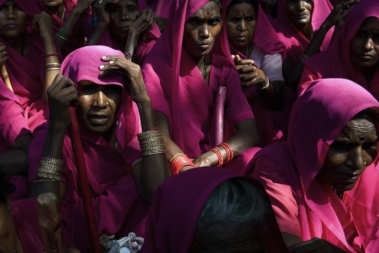 In her early twenties, having already had five children with her fairly uninspiring husband, Pal decided that she wants more control over her life. She put together enough money to buy a sewing machine by stealing grain from her own store and selling it back to the grocer for a lower sum. (She told her husband she found the money lying on the road.) Emboldened, she then decided she wanted to join a local, cash-strapped NGO and work for the awareness of women’s rights. Her husband kicked up a fuss, and so she fibbed; when an admirer unwittingly revealed her double-life, her resolve only increased: “I decided either I will become weaker than him or stronger than him." She went on to persuade local women to pool money in order to help women who find themselves in trouble. Borrowing money from a friend, she bought some cheap polyester saris as a uniform for these women. (They’re pink because every other color is already associated with a political party or a religion in India.)